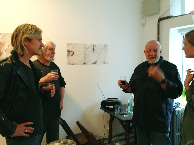Below, Frank listens appreciatively to a Troy-tale at my opening at